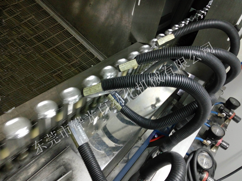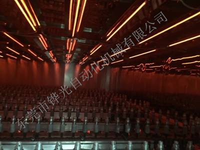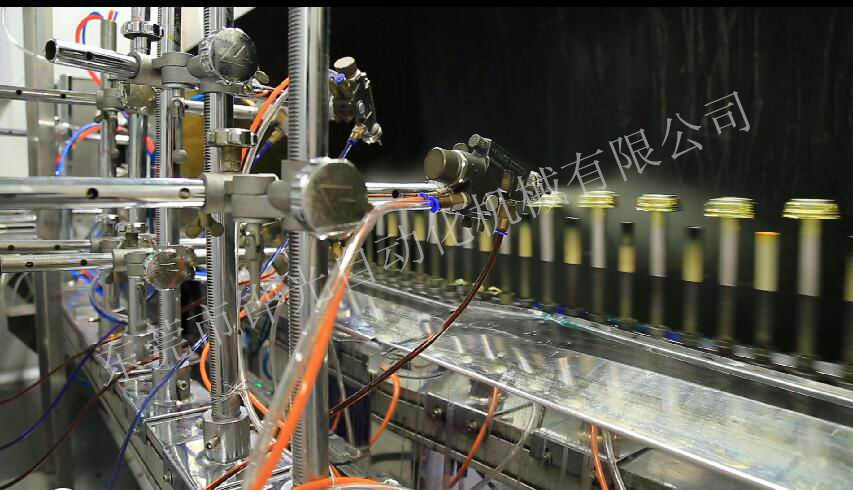 經(jīng)過(guò)火焰處理的基材通過(guò)輸送傳動(dòng)鏈進(jìn)入噴房,噴房?jī)?nèi)的噴槍向其噴射涂料.同時(shí)基材受強(qiáng)制回轉(zhuǎn)系統(tǒng)的控制而產(chǎn)生自轉(zhuǎn),使基材表面獲得均勻的涂層。